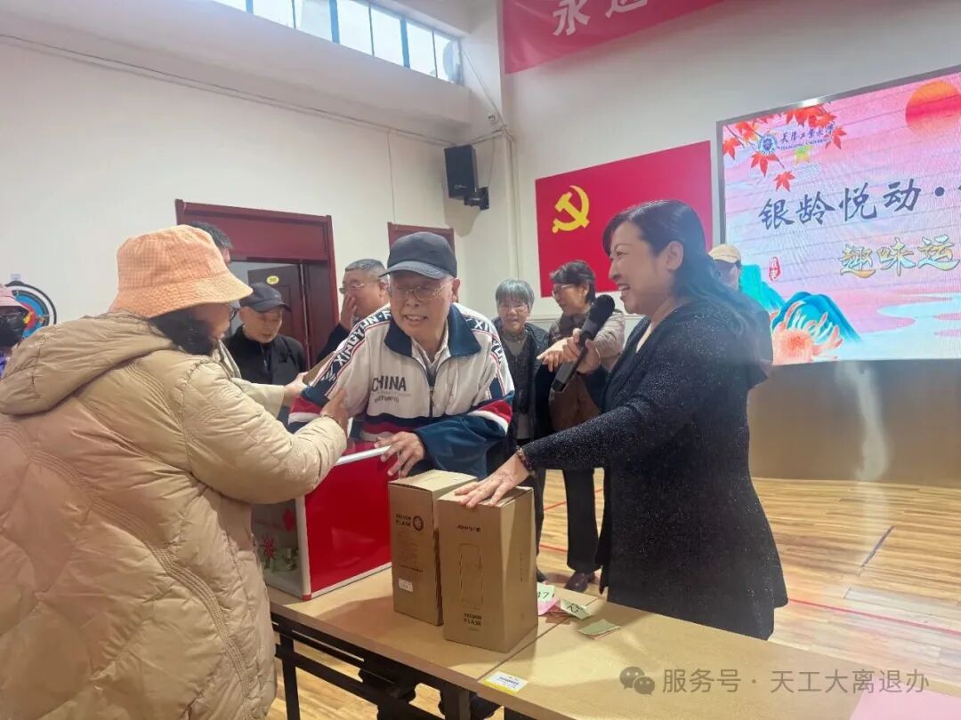 重阳节当天,备受期待的趣味运动会在原河东校区家属院离退休活动中心举行。共百余人参加了活动。运动会开始由老领导、老同志代表和离退办工作人员分别抽取了幸运参与者,获得幸运奖品的老同志高兴不已。